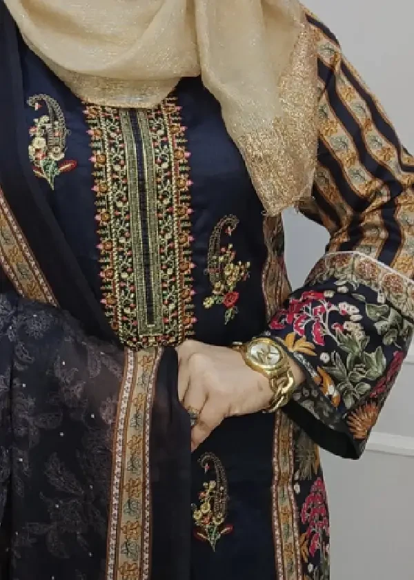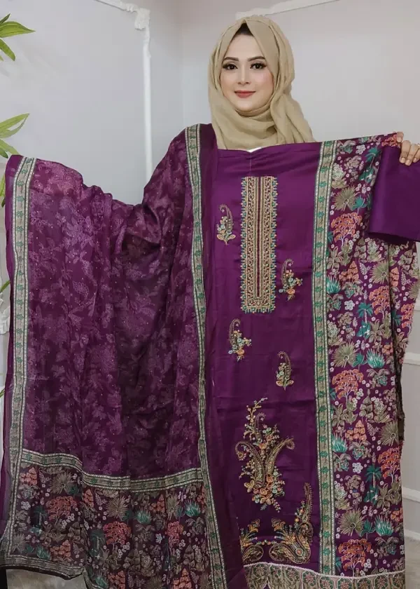 ✨ ব্লেন্ডেড জ্যাকার্ড ডিজিটাল প্রিন্ট উইথ কলকা এমব্রয়ডারি থ্রি-পিস ✨