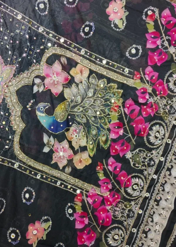 লাক্সারি লেজার জর্জেটে তৈরি Indian Inspire (Dazzling Black)। কামিজে অলওভার মিরর, স্টোন ও জারদৌসি কাজ, সাথে সিকোয়েন্স লেস ওয়ার্ক—গ্ল্যামারাস ও রিচ লুক।