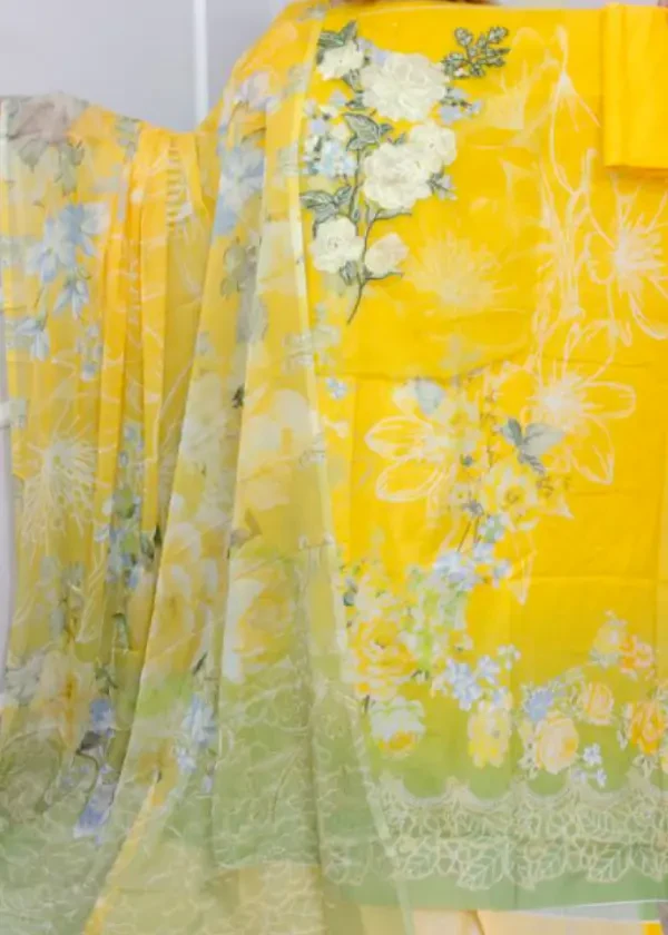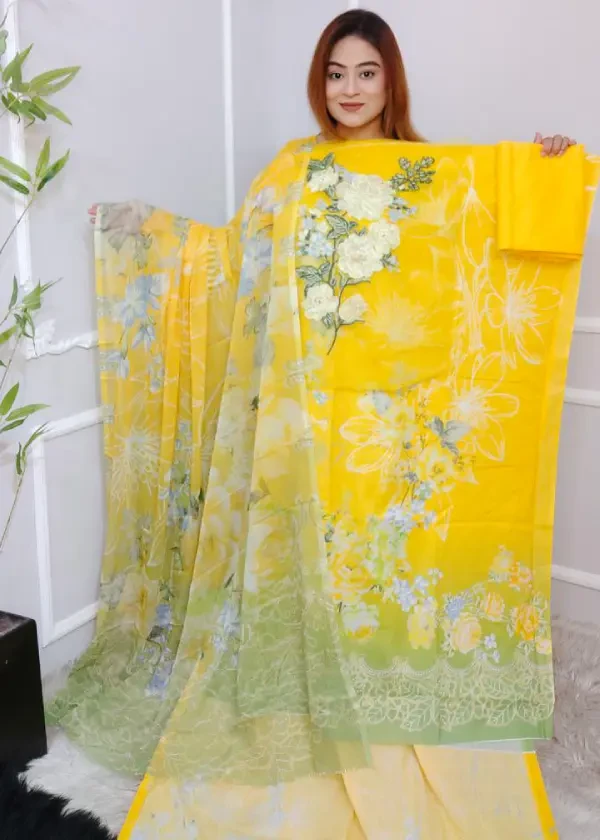 লাক্সারিয়াস কটন লন ফেব্রিকে তৈরি। এতে রয়েছে এলিগ্যান্ট ডিজিটাল প্রিন্টের সাথে ১টি হেভি এমব্রয়ডারি প্যাচ, যা ড্রেসটিকে আরও প্রিমিয়াম ও নজরকাড়া করে তুলেছে।
