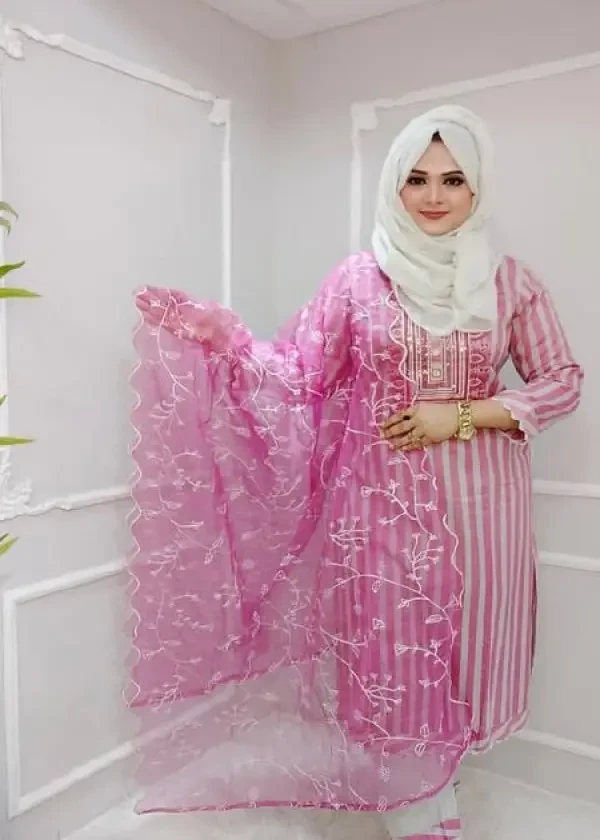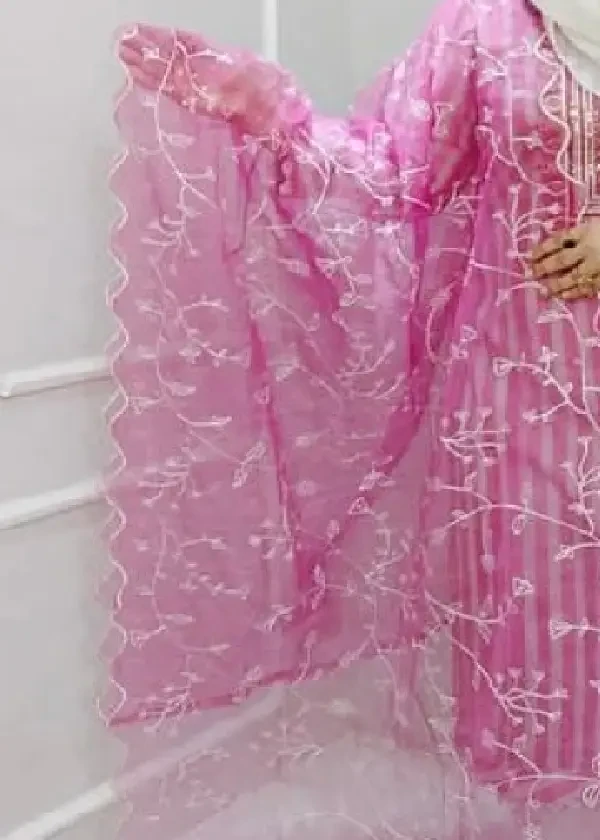 ওড়না: এই সেটটির প্রধান আকর্ষণ হলো এর ওড়নাটি। প্রিমিয়াম অর্গানজা ফ্যাব্রিকের ওপর শিফলি (Shifflie) ওয়ার্ক এবং বর্ডারে নিখুঁত কাটওয়ার্ক করা হয়েছে।