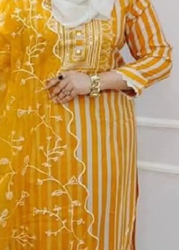 কামিজ: হাই-কোয়ালিটি মলমল কটন ফেব্রিক। এতে রয়েছে ট্রেন্ডি স্ট্রাইপ ডিজিটাল প্রিন্ট এবং পুরো বডিতে সূক্ষ্ম সিকোয়েন্স এমব্রয়ডারির কাজ, যা ড্রেসটিতে একটি গর্জিয়াস শাইন দেয়।