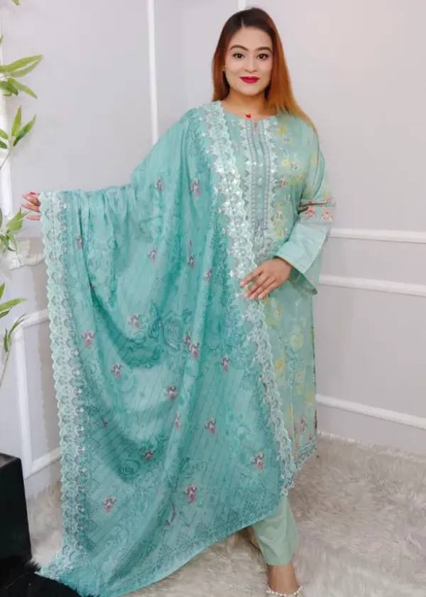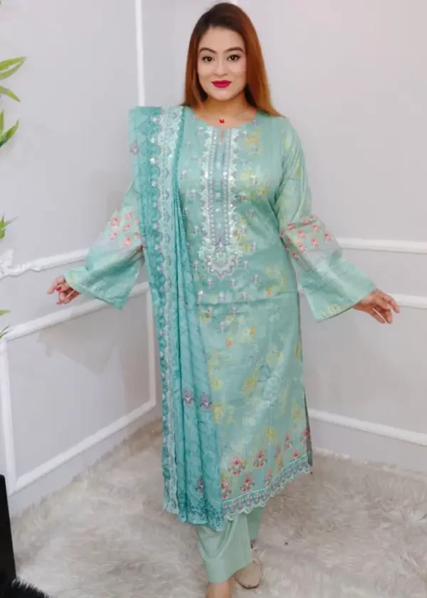 উন্নত মানের কটন ফেব্রিকে তৈরি। পুরো কামিজে রয়েছে সিকোয়েন্স এমব্রয়ডারি ও সুন্দর কাটওয়ার্ক, যা ড্রেসটিকে করে তোলে আরও শাইনিং ও আকর্ষণীয়।